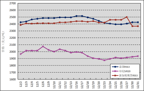 國外主產區:12月,泰國RSS3平均價格為2457美元/噸,環比上漲96美元/噸,最高價為2515美元/噸,最低價為2395美元/噸;印尼SIR20平均價格為1965美元/噸,環比上漲60美元/噸,最高價為2075美元/噸,最低價為1875美元/噸;新加坡RSS3期貨主力合約月均結算價格為2424美元/噸,環比上漲108美元/噸,最高價為2500美元/噸,最低價為2368美元/噸。
