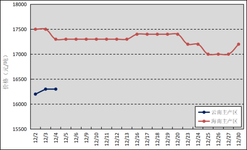 國內主產區:12月,云南產區在月初基本停割,海南產區原料產出較上月有所縮減。云南、海南鮮膠乳(折干膠)月均價格分別為16276元/噸、17282元/噸,環比上漲119元/噸、96元/噸。