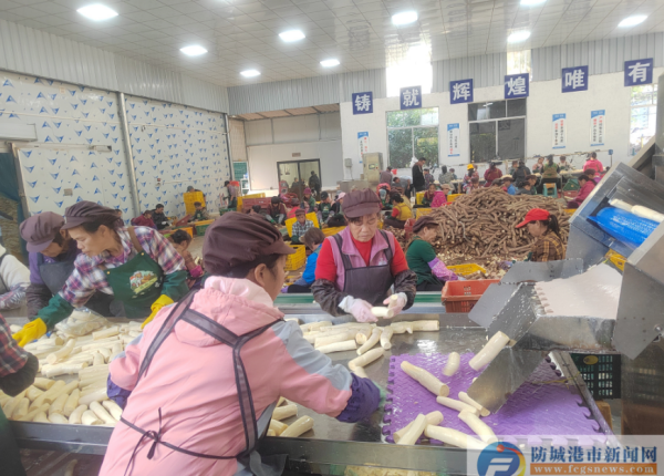 近日,在防城港市防城區大菉鎮喜農人種養專業合作社(以下簡稱喜農人合作社)“華南9號”黃心木薯加工廠現場,工人們正熟練地操作手中的工具將木薯剝皮、取芯,清理后的木薯被傳送帶送入機器內清洗,再由工人真空打包后送往冷凍庫冷藏,現場一派繁忙景象。