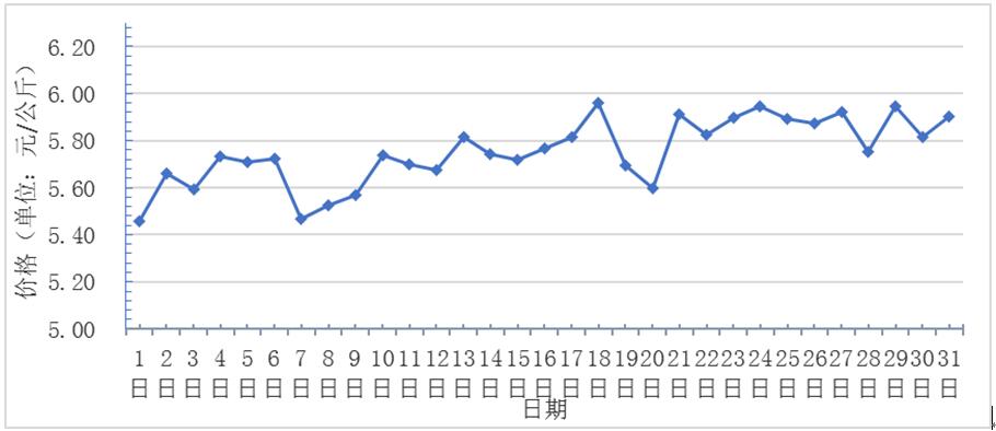 12月,全國重點監測農產品批發市場香蕉總交易量達9.5萬噸,同比上漲10.5%,環比上漲5.6%;總交易價值 56723.6萬元,同比上漲50.8%,環比上漲16.7%。日平均價格最高為6元/千克,最低為5.5元/千克,全月平均價格為5.8元/千克,同比上漲23.4%,環比上漲9.4%(每日價格變化如圖)。
