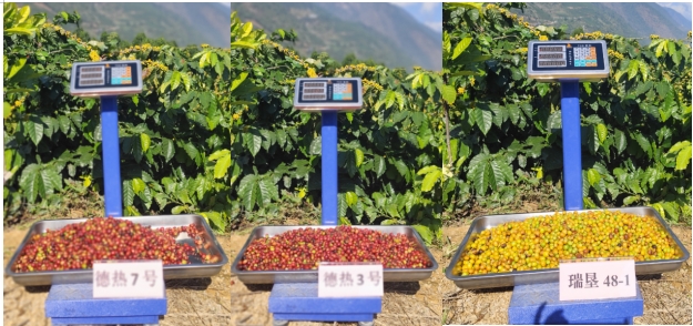 “德熱7號(hào)”系云南省德宏熱帶農(nóng)業(yè)科學(xué)研究所從葡萄牙熱帶研究所(IICT)咖啡銹病研究中心(CIFC)引進(jìn)育種材料SL18-Sarchimor選育而成,“瑞墾48-1”系云南省德宏熱帶農(nóng)業(yè)科學(xué)研究所從農(nóng)業(yè)農(nóng)村部瑞麗咖啡種質(zhì)資源圃咖啡種質(zhì)Catimor P129群體中發(fā)現(xiàn)的橙黃色變異單株經(jīng)系統(tǒng)選擇法培育而成。兩個(gè)品種均完成了品種比較試驗(yàn)、區(qū)域性試驗(yàn)和生產(chǎn)性試驗(yàn)。“德熱7號(hào)”具有生勢(shì)強(qiáng),二、三分枝發(fā)達(dá),抗銹性強(qiáng),杯品質(zhì)量好等優(yōu)點(diǎn),經(jīng)現(xiàn)場(chǎng)測(cè)產(chǎn),潞江壩試驗(yàn)點(diǎn)平均單株鮮果重6.01kg,按畝植333株折合,畝產(chǎn)鮮果2001.33kg;瑞麗試驗(yàn)點(diǎn)平均單株鮮果重5.21kg,按畝植333株折合,畝產(chǎn)鮮果1734.93kg。“瑞墾48-1”具有葉片大而厚,植株生勢(shì)強(qiáng),杯品質(zhì)量好,青瓜風(fēng)味明顯等優(yōu)點(diǎn),經(jīng)現(xiàn)場(chǎng)測(cè)產(chǎn),潞江壩試驗(yàn)點(diǎn)平均單株鮮果重5.34kg,按畝植333株折合,畝產(chǎn)鮮果1778.22kg;瑞麗試驗(yàn)點(diǎn)平均單株鮮果重5.05kg,按畝植333株折合,畝產(chǎn)鮮果1681.65kg。