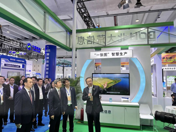 農業農村部副部長江文勝在中國農墾展區聽取中國農墾用地“一張圖”介紹