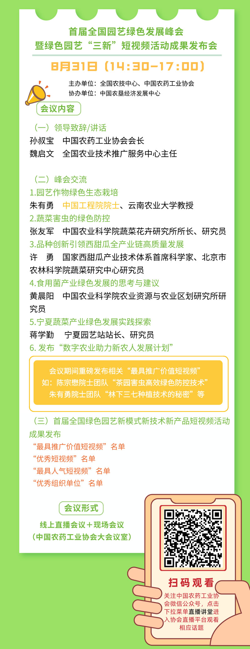 為深入貫徹落實綠色發展理念,用新方式推廣園藝綠色生產新模式、新技術、新產品,助推提高園藝產業質量效益與競爭力和保障重要農產品有效供給,全國農技中心會同中國農藥工業協會聯合舉辦首屆全國綠色園藝新模式新技術新產品(以下簡稱“三新”)短視頻學習交流活動。各地農技部門、科研教學單位園藝生產主體和農資服務主體等積極參加,共制作了300多個“三新”短視頻用于學習交流,活動組委會從中推評出了一批最具推廣價值短視頻和優秀短視頻。為進一步擴大活動宣傳覆蓋面,中國農藥工業協會將于2021年8月31日以線上直播形式舉辦首屆全國園藝綠色發展峰會暨“三新”短視頻學習交流活動成果發布會。